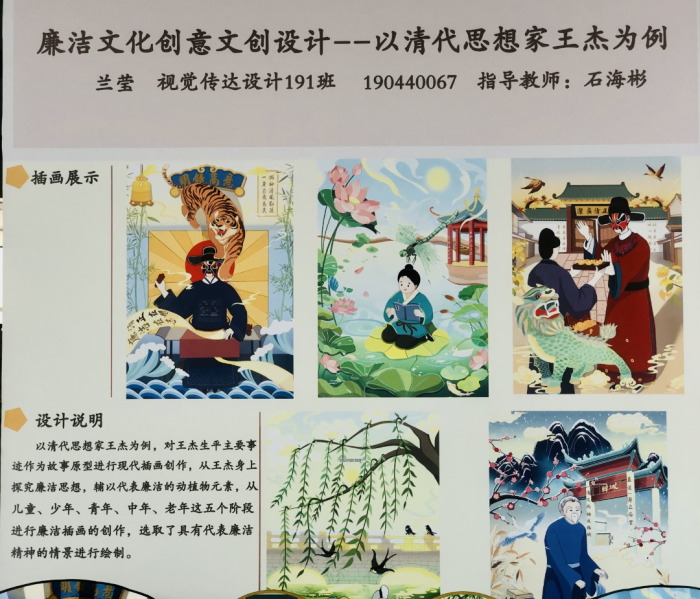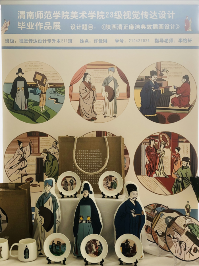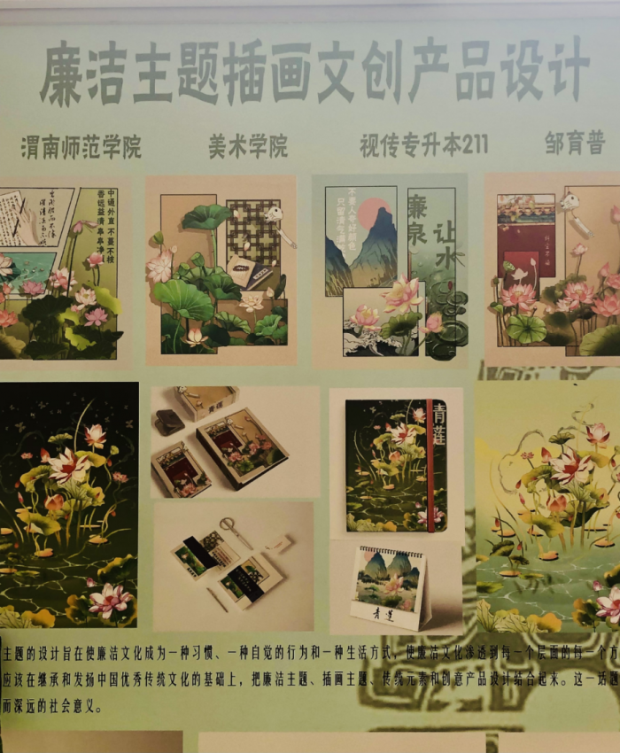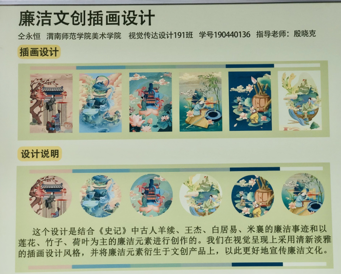 經(jīng)過多方努力,“匠心·清韻”文創(chuàng)作品展成功展出,涵蓋了生活用品、文化用品、裝飾用品等方面,所有產(chǎn)品都是以渭南文化文物資源為創(chuàng)作元素,素材豐富,構(gòu)思巧妙,用色大膽,形式新穎,具有獨特的藝術(shù)性、觀賞性和實用性。其中,400多件清廉文創(chuàng)產(chǎn)品,以其頗具個性、貼近生活的獨特設(shè)計,讓現(xiàn)場觀眾連連稱贊。其中,渭南師范學(xué)院美術(shù)學(xué)院學(xué)生仝永恒的畢業(yè)設(shè)計作品廉潔文創(chuàng)插畫,這個設(shè)計是結(jié)合《史記》中古人羊續(xù)、王杰、白居易、米襄的廉潔事跡和以蓮花、竹子、荷葉為主的廉潔元素進行創(chuàng)作的。在視覺呈現(xiàn)上采用清新淡雅的插畫設(shè)計風(fēng)格,并將廉潔元素衍生于文創(chuàng)產(chǎn)品上,以此更好地宣傳廉潔文化。仝永恒現(xiàn)場還向大家展示了豐富多樣的文創(chuàng)產(chǎn)品,深得大家喜歡。除此之外,印有廉潔故事的蒲扇,雕刻著廉潔元素的手機殼……眾多渭南廉潔文化故事被融入到日常的生活用品中,讓渭南廉潔文化隨處散發(fā)魅力,清廉渭南建設(shè)真正實起來、活起來。