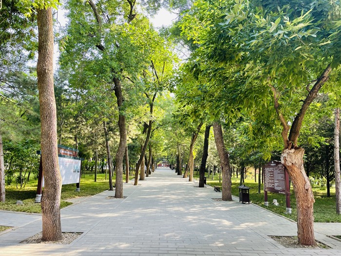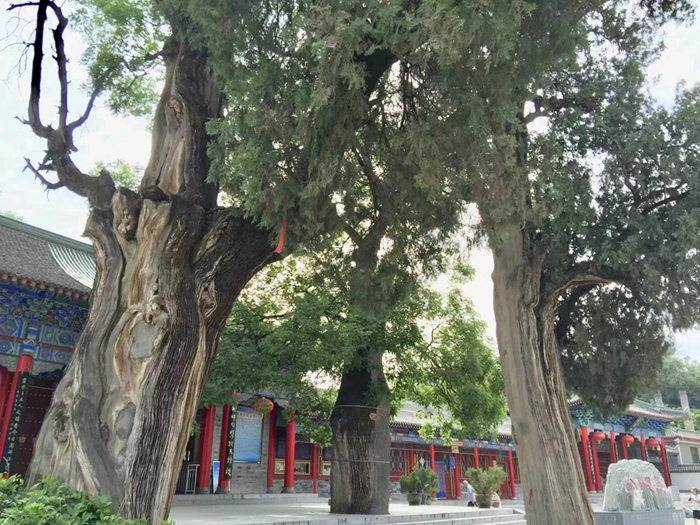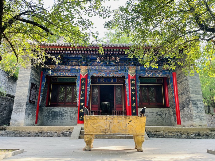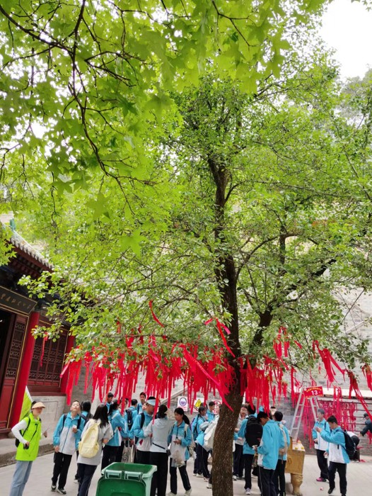 王鵬是一位資深的文史工作者。按照他的指引,我踏進(jìn)了周公廟景區(qū)大門,經(jīng)過樂樓、八卦亭、周公獻(xiàn)殿、周公正殿,來到了召公殿。老遠(yuǎn)望去,召公殿門前長著兩棵枝葉茂盛的大樹,他指著樹說這就是人們時(shí)常向往的甘棠樹。召公殿前,西安市一中學(xué)五十多名來這里研學(xué)的師生站在甘棠樹下,聆聽著講解員講述有關(guān)召公史跡及甘棠樹的故事。