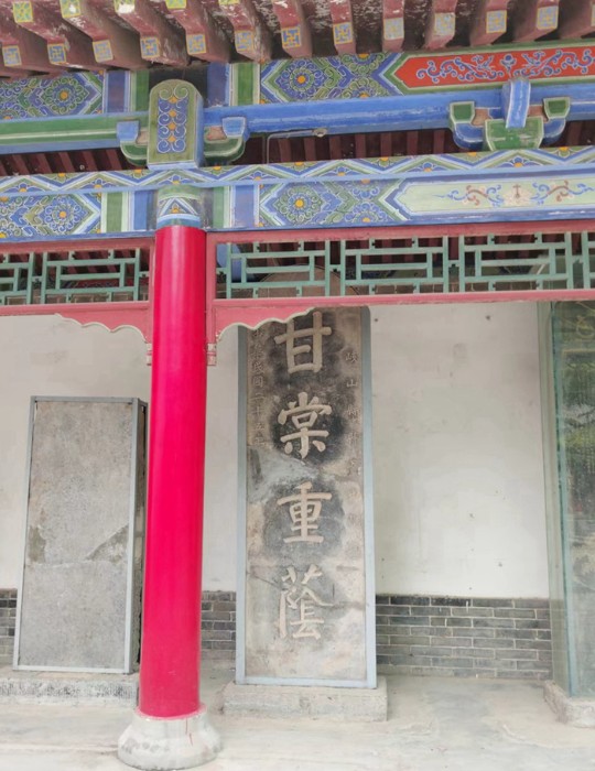 我們邊走邊說,不知不覺來到了周公廟碑廊。周公廟碑廊位于樂樓的東西兩廂,排列著通通碑石,召公甘棠圖石碑陳列于東廂碑廊內(nèi),石碑上“甘棠重蔭”四個(gè)字特別顯眼。召公甘棠圖碑高210厘米,寬74厘米,厚15厘米,圓首方身,碑首素面,碑體保存完好。召伯甘棠圖碑系清道光二十五年(1845)岐山縣令李文瀚偕幕僚在召亭故地春游訪古時(shí),見甘棠古樹,有感于召公德政,運(yùn)用傳統(tǒng)寫生手法繪制了甘棠樹,并撰寫《甘棠圖記》文一篇,道光二十七年(1847)岐山武澄得到李文瀚甘棠圖、文粉本,鐫刻上石。石碑右上部鐫“召伯甘棠圖”篆書五字,左上部鐫李文瀚撰寫的《甘棠圖記》文章,中下部為甘棠樹全形,左下部鐫武澄題識(shí),右下部鈐李文瀚“家在江城畫里”朱文印一方。 明萬歷年《岐山縣志》記載:甘棠樹在陜西岐山召公廟內(nèi)考此甘棠原系周召公循行所憩處三千年來古干猶存殊為可貴據(jù)村人云枝葉本茂民國二十五年忽為颶風(fēng)吹折致今僅存此一勁曲枯干詩云蔽芾甘棠勿翦勿伐召伯所發(fā)蓋即指此。