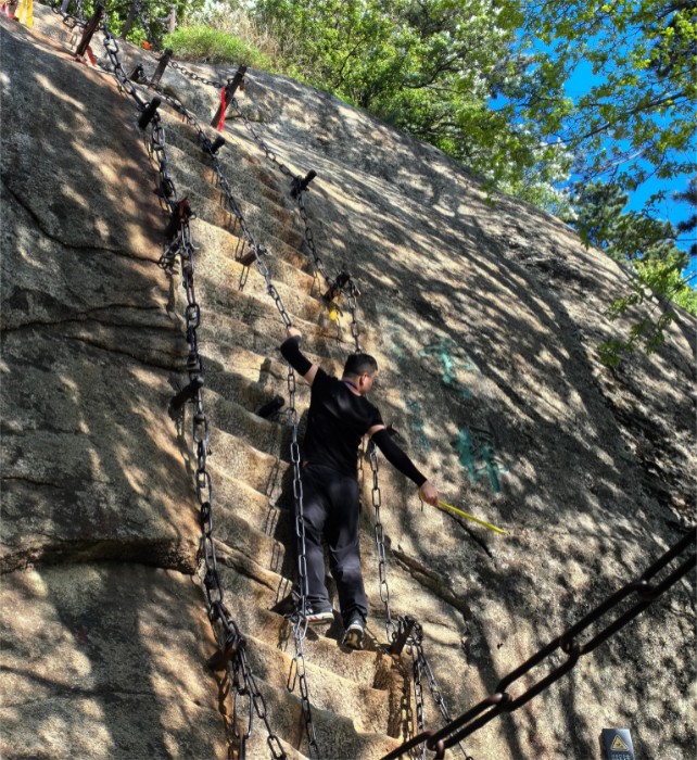為全面摸清梳理華山摩崖石刻文化遺產(chǎn)情況,保護傳承好這一獨特的文化景觀,由華山風景名勝區(qū)管理委員會、西岳廟文物管理處、西北大學文化遺產(chǎn)學院等單位聯(lián)合組成調(diào)研團隊,自2023年10月至2024年6月開展了華山摩崖石刻文化遺產(chǎn)調(diào)查研究專項工作。經(jīng)過9個月的努力,共統(tǒng)計建檔石刻739處,對照第三次文物普查統(tǒng)計602處石刻,本次調(diào)查新發(fā)現(xiàn)137處,年代最早的石刻為北宋元祐三年“游師雄觀黃神潭留題”,且石刻書法類型豐富,包括篆書、隸書、楷書、行書、草書等。 本次調(diào)研范圍主要包括華山主景區(qū)及仙峪、翁峪、黃甫峪等附屬區(qū)域,分為資料搜集、實地測繪、資料整理匯編等工作階段,通過照片拍攝、文字記錄、無人機航拍等方式對華山景區(qū)進行了細致、全面的調(diào)查,對景區(qū)內(nèi)摩崖石刻進行了全面的調(diào)查研究。華山自古以來就有“奇險天下第一山”之稱,地形復雜、植被茂盛、大量石刻處于懸崖峭壁之上,且天氣多變、游客眾多,為調(diào)研工作帶來極大的困難。調(diào)研團隊克服一切不利條件,邊測繪邊整理,對石刻尺寸、傾角、方位等基本信息、保存現(xiàn)狀和病害情況(如流水侵蝕、生物病害等)進行了詳細記錄。