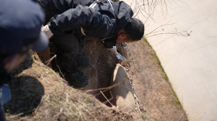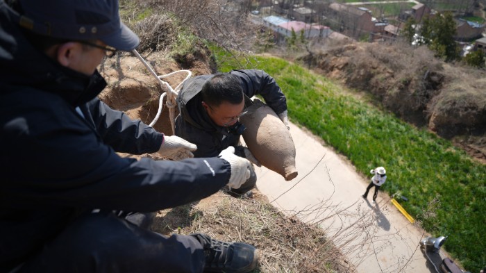 在采集過程中,不時有大量碎土掉落土塬壁下,伴隨有嗆鼻的塵土。這時,渭南市博物館考古勘探部顧問吳勝利卻拿著手鏟在土里翻找。就當(dāng)眾人疑惑之際,吳勝利從碎土里找出一些碎陶片,連忙讓工作人員裝進標本袋中。吳勝利告訴隨行人員:“這些碎陶片,一個都不能丟,隨后進行文物修補時,會完美合縫哩!