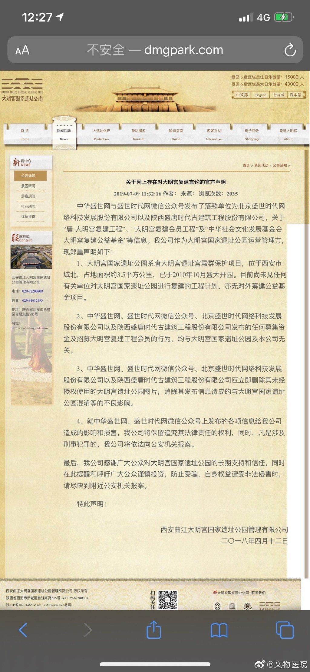 “大明宮復(fù)建工程”千億項(xiàng)目落戶 大荔縣政府聲明毫不知情文化藝術(shù)網(wǎng)-文化藝術(shù)報(bào)訊 11月11日,多家媒體發(fā)布消息稱:陜西盛唐時(shí)代“大明宮復(fù)建工程啟動(dòng)儀式”新聞發(fā)布會(huì)在西安大唐西市舉行,千億項(xiàng)目落戶渭南市大荔縣。 11月12日21:29,大荔縣人民政府新聞辦公室在縣政府官方網(wǎng)站發(fā)布《鄭重聲明》(網(wǎng)址:http://www.dalisn.gov.cn/xwzx/tzgg/121861.htm),對(duì)此發(fā)布會(huì)“毫不知情”,發(fā)布會(huì)中所涉項(xiàng)目從未在該縣有關(guān)部門備案,就相關(guān)媒體發(fā)布信息給該縣“造成的影響和損害”,該縣“將保留追究其法律責(zé)任的權(quán)利”。 而此前,“曲江新區(qū)”公眾號(hào)2018年4月12日信息顯示,西安曲江大明宮遺址公園管理有限公司作為大明宮國(guó)家遺址公園運(yùn)營(yíng)管理方發(fā)布《鄭重聲明》,稱無復(fù)建項(xiàng)目、無基金項(xiàng)目,要求涉事方刪除侵犯大明宮公園權(quán)益的侵權(quán)圖片,“將保留追究其法律責(zé)任的權(quán)利”。 2019年7月9日,大明宮國(guó)家遺址公園官方網(wǎng)站發(fā)布《關(guān)于網(wǎng)上存在對(duì)大明宮復(fù)建言論的官方聲明》,而內(nèi)容與2018年4月12日“《鄭重聲明》”完全一致。 此事件真相到底如何,文化藝術(shù)網(wǎng)-文化藝術(shù)報(bào)將繼續(xù)關(guān)注。 ———————————————————————————————————————————————————— 鄭重聲明 近日,陜西網(wǎng)、榮耀渭南、縱觀陜西等多家媒體平臺(tái)發(fā)布的陜西盛唐時(shí)代“大明宮復(fù)建工程啟動(dòng)儀式”新聞發(fā)布會(huì)在絲綢之路起點(diǎn)西安大唐西市舉行,千億項(xiàng)目落戶渭南市大荔縣的新聞報(bào)道,引起了多方關(guān)注。大荔縣作為所謂項(xiàng)目“落戶地”,現(xiàn)鄭重聲明如下: 1.陜西盛唐時(shí)代“大明宮復(fù)建工程啟動(dòng)儀式”新聞發(fā)布會(huì),大荔縣委、縣政府既沒有收到相關(guān)方面的邀請(qǐng),也未委派任何單位及個(gè)人參加,對(duì)此事毫不知情。 2.陜西盛唐時(shí)代古建筑工程股份有限公司、文化旅游部中華社會(huì)文化發(fā)展基金會(huì)大明宮復(fù)建公益基金、中商景天(西安)實(shí)業(yè)有限公司啟動(dòng)的“大明宮復(fù)建工程與唐長(zhǎng)安城縮建公益工程項(xiàng)目”從未在我縣發(fā)改、土地等部門申報(bào)、備案。 3.關(guān)于大明宮復(fù)建工程與唐長(zhǎng)安城縮建公益工程項(xiàng)目的任何募集資金及招募行為,均與大荔縣無關(guān)。 4.就相關(guān)媒體發(fā)布的各項(xiàng)信息給我縣造成的影響和損害,我們將保留追究其法律責(zé)任的權(quán)利。 大荔縣人民政府新聞辦公室 2019年11月12日