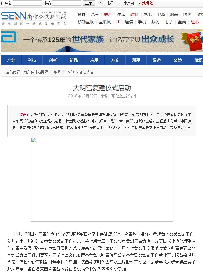 附錄3:大明宮復(fù)建儀式啟動(dòng) 2018年12月02日 來源:南方企業(yè)新聞網(wǎng) 11月30日,中國(guó)優(yōu)秀企業(yè)家歡迎晚宴在北京千禧酒店舉行。全國(guó)政協(xié)常委、港澳臺(tái)僑委員會(huì)副主任劉凡,十一屆財(cái)經(jīng)委員會(huì)委員副主任、九三學(xué)社第十二屆中央委員會(huì)副主席賀鏗,經(jīng)濟(jì)日?qǐng)?bào)社原總編輯馮并,國(guó)家發(fā)展和改革委員會(huì)直屬機(jī)關(guān)黨委原常務(wù)副書記金德本,中華社會(huì)文化發(fā)展基金會(huì)大明宮復(fù)建公益基金管委會(huì)主任劉變花,中華社會(huì)文化發(fā)展基金會(huì)大明宮復(fù)建公益基金管委會(huì)副主任董亞芬、陜西盛世時(shí)代影視傳播股份有限公司董事長(zhǎng)盧建國(guó),陜西盛唐時(shí)代古建筑工程股份有限公司副董事長(zhǎng)周步青等出席了此次晚宴,數(shù)百名來自全國(guó)各地?cái)?shù)百名優(yōu)秀企業(yè)家代表也紛紛參加。 活動(dòng)中,賀鏗、金德本在講話中指出如今眾多優(yōu)秀企業(yè)家在取得了輝煌成就之后,也不忘積極回饋社會(huì),踐行公益,其中大明宮復(fù)建暨長(zhǎng)安城縮建公益工程就是代表之一。 大明宮與唐長(zhǎng)安城是我國(guó)重要的文化符號(hào),是中國(guó)唐朝的皇宮,是中國(guó)鼎盛期王朝的標(biāo)志性建筑,在長(zhǎng)達(dá)200余年的歲月中,大明宮是中國(guó)的政治、經(jīng)濟(jì)和文化中心。 (中華社會(huì)文化發(fā)展基金會(huì)大明宮復(fù)建公益基金管委會(huì)主任劉變花) (陜西盛唐時(shí)代古建筑工程股份有限公司副董事長(zhǎng)周步青) 中華社會(huì)文化發(fā)展基金會(huì)大明宮復(fù)建公益基金管委會(huì)主任劉變花上臺(tái)介紹了這一工程,她表示,大明宮復(fù)建暨唐長(zhǎng)安城縮建公益工程基金由中華社會(huì)文化發(fā)展基金會(huì)發(fā)起設(shè)立。2016年5月17日,“大明宮復(fù)建公益基金”獲中華社會(huì)文化發(fā)展基金會(huì)批復(fù)。2017年6月30日,“唐長(zhǎng)安城縮建公益項(xiàng)目”獲中華社會(huì)文化發(fā)展基金會(huì)批復(fù)。兩大世紀(jì)建筑工程的批復(fù)將如并蒂芬芳的“姊妹花”和“子母工程”,在中華大地?fù)P帆起航。 同時(shí),賀鏗也在講話中指出,“大明宮復(fù)建暨唐長(zhǎng)安城縮建公益工程”是一個(gè)偉大的工程,是一個(gè)再現(xiàn)歷史勝境的中華復(fù)興之路的節(jié)點(diǎn)工程,更是一個(gè)世界文化遺產(chǎn)的振興項(xiàng)目,是“一帶一路”的燈塔級(jí)工程。工程落成之后,中國(guó)歷史上最宏偉和最大的“唐代宮殿建筑群及唐都長(zhǎng)安”將再現(xiàn)于中華錦繡大地,中國(guó)歷史巔峰文明將再次閃耀華夏九州。