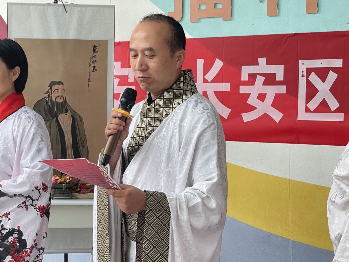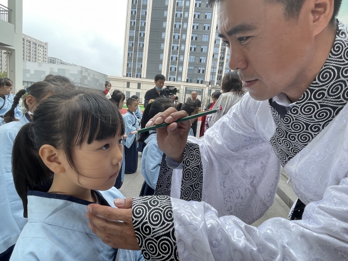 當(dāng)天,師生們身著中華傳統(tǒng)漢服,隨著贊禮官的引導(dǎo),老師們?yōu)殚_學(xué)第一天的一年級(jí)小學(xué)生正衣冠、點(diǎn)朱砂,學(xué)生們拜孔子、禮謝親師、誦讀經(jīng)典,整個(gè)開筆禮儀式充滿濃濃的儀式感。