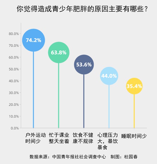 近些年,我國(guó)青少年肥胖率快速上升。肥胖對(duì)青少年的身心發(fā)育都會(huì)產(chǎn)生負(fù)面影響。隨著越來(lái)越多“小胖墩”出現(xiàn)在我們身邊,青少年肥胖問題已成為重要的公共衛(wèi)生問題。 日前,中國(guó)青年報(bào)社社會(huì)調(diào)查中心聯(lián)合問卷網(wǎng)(wenjuan.com),對(duì)1979名中小學(xué)生家長(zhǎng)進(jìn)行的一項(xiàng)調(diào)查顯示,53.6%的受訪家長(zhǎng)感到身邊肥胖的孩子非常多,戶外運(yùn)動(dòng)時(shí)間少被指為“罪魁禍?zhǔn)住薄?/span> 受訪家長(zhǎng)中,68.3%孩子體型適中,16.9%偏胖,14.8%偏瘦。43.8%孩子讀小學(xué)低年級(jí),36.7%讀小學(xué)高年級(jí),13.7%讀初中,5.8%讀高中。 53.6%受訪家長(zhǎng)感到身邊肥胖的孩子非常多 北京市民張秋節(jié)(化名)是一名新手媽媽,她發(fā)現(xiàn)現(xiàn)在肥胖的孩子不少。“我們每個(gè)月去兩次社區(qū)醫(yī)院,每次都能看到肥胖的小孩,從新生兒到幾歲的都有”。 安徽省馬鞍山市高三學(xué)生王希(化名)說(shuō),她身邊有五六名胖胖的同學(xué)!拔矣^察到,有的同學(xué)高二時(shí)身材還不胖,一升入高三就明顯發(fā)胖了”。她感覺身邊肥胖的同學(xué)比以前多了。 96.6%的受訪家長(zhǎng)身邊都有肥胖的孩子,其中,53.6%的受訪家長(zhǎng)直言肥胖的孩子非常多。 王希感覺,自己平時(shí)運(yùn)動(dòng)太少了,“課間大家都在教室里學(xué)習(xí),我也就不想出去活動(dòng)了。學(xué)校偶爾會(huì)組織運(yùn)動(dòng),但起不到根本作用。因?yàn)楦呷龑W(xué)習(xí)任務(wù)重,大家基本都是一坐一整天”。 “到了高三,體育課也不太受重視。而且我現(xiàn)在課間特別喜歡吃東西,有時(shí)不是真的餓,就是這樣能減壓,比較舒服!蓖跸Uf(shuō)。 高中生家長(zhǎng)李春認(rèn)為,造成青少年肥胖,一是現(xiàn)在生活條件好了,一日三餐營(yíng)養(yǎng)提高了,存在過量攝入。二是如今孩子們運(yùn)動(dòng)量少,放學(xué)了要么忙于學(xué)習(xí),要么就是玩手機(jī)電腦,不出門玩兒了。 造成青少年肥胖的原因上,戶外運(yùn)動(dòng)時(shí)間少被指為“罪魁禍?zhǔn)住保?4.2%的受訪家長(zhǎng)選擇此項(xiàng)。其次是忙于課業(yè)整天坐著(63.8%)。其他主要還有:飲食不健康、不規(guī)律(53.6%),心理壓力大,暴飲暴食(44.0%),睡眠時(shí)間少(35.4%)。 河北省人民醫(yī)院營(yíng)養(yǎng)科主任張曉偉分析,造成青少年肥胖高發(fā)的第一個(gè)原因,就是學(xué)習(xí)負(fù)擔(dān)太重,戶外活動(dòng)和鍛煉的機(jī)會(huì)減少。“很多孩子是除了學(xué)習(xí)就沒別的事干”。第二個(gè)原因,是青少年飲食習(xí)慣和飲食結(jié)構(gòu)有待提高。學(xué)生學(xué)習(xí)比較緊張,可能隨隨便便就喝下一杯可樂,再吃一些煎餅、油條、燒餅、漢堡、炸雞等高能量食品,這些能量要運(yùn)動(dòng)很長(zhǎng)時(shí)間才能消耗掉。第三個(gè)原因,就是隨著年級(jí)的升高,學(xué)生們的學(xué)習(xí)壓力上來(lái)了,晚上熬夜的時(shí)候多了。這都導(dǎo)致發(fā)生肥胖的可能性增加。 71.8%受訪家長(zhǎng)指出青少年肥胖影響身體健康 王希坦言,高三學(xué)習(xí)任務(wù)重、心理壓力大,如果分?jǐn)?shù)一直提不上去,老師家長(zhǎng)都跟著著急,自己不知道能干點(diǎn)啥的時(shí)候,就只想吃東西,身體發(fā)胖了就更愛吃東西,形成惡性循環(huán),“而且很多同學(xué)都不重視身體健康,覺得還小還年輕”。 李春認(rèn)為,肥胖會(huì)影響到孩子身體正常發(fā)育,也會(huì)影響到學(xué)習(xí)!耙?yàn)榉逝值暮⒆酉鄬?duì)來(lái)講容易疲勞,注意力不容易集中,更難得到好的學(xué)習(xí)效果”。 張曉偉介紹,心理上,孩子們?nèi)绻l(fā)胖,被別人起外號(hào)的機(jī)會(huì)就多了,時(shí)間久了可能會(huì)對(duì)心理產(chǎn)生一些影響。尤其隨著青少年愛美意識(shí)的增強(qiáng),自卑、不合群的情況就會(huì)變多,產(chǎn)生負(fù)面情緒。軀體上,脂肪組織是重要的內(nèi)分泌器官。當(dāng)肥胖發(fā)生,脂肪蓄積超過一定程度,會(huì)對(duì)青少年體內(nèi)的雌激素、孕激素、生長(zhǎng)激素等眾多激素產(chǎn)生一定的影響!坝行┖⒆泳蜁(huì)表現(xiàn)出來(lái)一些異常情況:比如小女孩兒長(zhǎng)小胡子,皮膚毛孔比較粗大,男孩子可能還會(huì)有一些‘滿月臉’,大腿跟腹部有一些肥胖紋。影響到孩子的生長(zhǎng)發(fā)育”。 肥胖給青少年帶來(lái)的問題不容忽視。調(diào)查顯示,71.8%的受訪家長(zhǎng)感到更容易出現(xiàn)身體健康問題,59.5%的受訪家長(zhǎng)指出在同齡人中被區(qū)別看待,不利于社交交友,53.4%的受訪家長(zhǎng)指出影響身體發(fā)育,48.8%的受訪家長(zhǎng)表示容易形成自卑心理。 69.3%受訪家長(zhǎng)希望學(xué)校督促學(xué)生課間多進(jìn)行體育鍛煉 王希覺得,學(xué)校要鼓勵(lì)大家運(yùn)動(dòng),設(shè)計(jì)一些日常化的活動(dòng)項(xiàng)目,老師們不要拖堂。食堂也得為學(xué)生提供健康有質(zhì)量的食品。 69.3%的受訪家長(zhǎng)希望學(xué)校能夠督促學(xué)生課間多進(jìn)行體育鍛煉,64.6%的受訪家長(zhǎng)建議學(xué)校重視體育課,多進(jìn)行體育運(yùn)動(dòng),42.2%的受訪家長(zhǎng)認(rèn)為要提高課堂質(zhì)量,減輕學(xué)生課后負(fù)擔(dān)。 對(duì)于家長(
