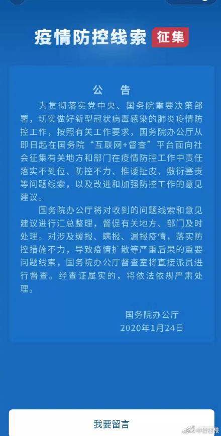 轉(zhuǎn)發(fā)周知!微信開通疫情線索征集入口24日起,國務(wù)院辦公廳在國務(wù)院“互聯(lián)網(wǎng)+督查”平臺面向社會征集有關(guān)地方和部門在疫情防控工作中責(zé)任落實不到位、防控不力、推諉扯皮、敷衍塞責(zé)等問題線索,以及改進和加強防控工作的意見建議,F(xiàn)在,打開微信進入支付界面,點擊城市服務(wù),選擇“疫情督查”,就可以跳轉(zhuǎn)到國務(wù)院的征集頁面了!轉(zhuǎn)發(fā),周知!