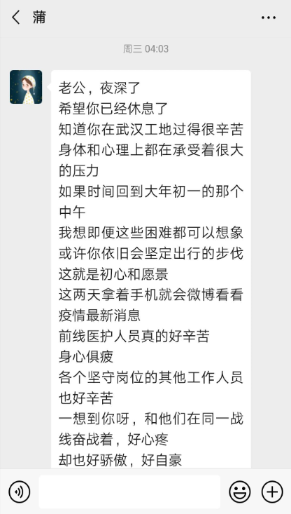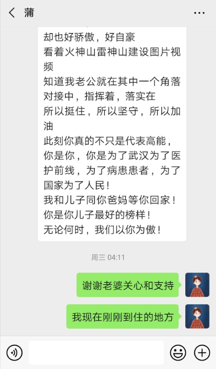 圖為離家前,向鋒與妻拍攝的合照。 記者:奔赴前線,家人一定是非常掛念的,工作中是怎樣與家人溝通報平安的呢? 向鋒:這次的項目建設(shè)時間相當(dāng)緊迫,回復(fù)家人的信息很不及時。來雷神山現(xiàn)場第一天晚上,工作到了次日凌晨4點,我收工準(zhǔn)備休息時,收到了我愛人給我來的微信。看完整條微信,我很感動,甚至流出了眼淚。感謝家人對我工作的支持,他們是所有現(xiàn)場施工人員堅強的后盾。雖然不能時刻回復(fù)家人的信息,但我會定時向家里報平安,讓家人安心。