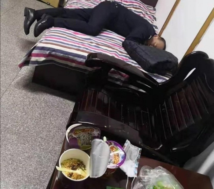 楊文波 張衛(wèi) 邊文貴 治安大隊民警 “疫情就是警情!非常時期,正是考驗我們的時候。作為黨員要對得起胸前的黨員徽章,對得起入黨時許下的錚錚誓言!2月2日凌晨1時10分,報送完最后一組核查數(shù)據(jù)后,他準備給自己和同事泡桶方便面當宵夜,可在等待水燒開的過程中已酣然入睡。勞累面前,形象已然顧不來。他是@府谷公安 新型冠狀病毒感染肺炎疫情防控工作領導小組辦公室核查專班負責人楊文波,給他拍照的同事是核查專班的組長邊文貴,和他倆一起加班到深夜的是民警張衛(wèi)。從大年初一晚上十點多被叫到單位到此刻,他們?nèi)诉未回過家。連續(xù)奮戰(zhàn)的七天七夜,他們吃、住、辦公都在單位,24小時隨時待命。疫情就是命令,防控就是責任!他們艱辛地堅守,是因為他們堅定地堅信:疫情在前,警察不退!把守關鍵環(huán)節(jié),阻止疫情傳播!
