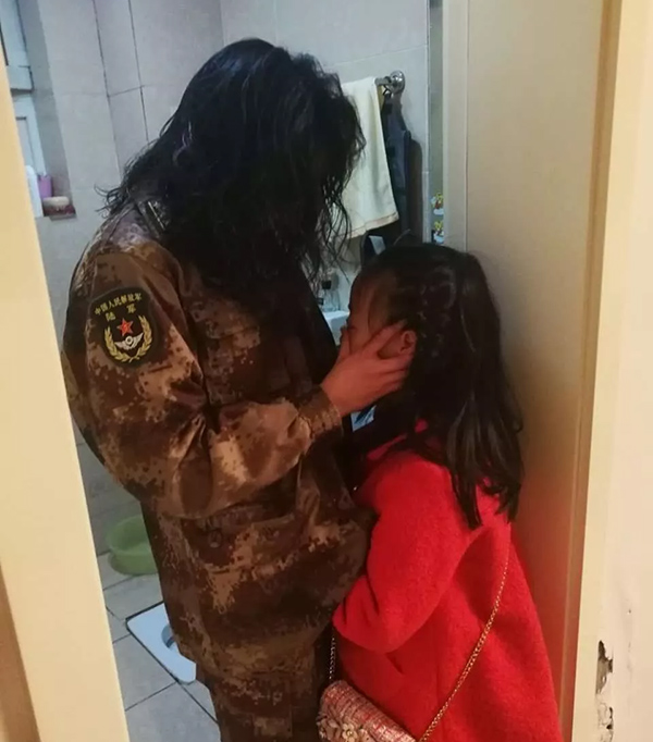 啟程前夕,拂去孩子眼角的淚水:“寶貝不哭,媽媽要去幫助更多人!”。(圖片來源:人民陸軍微信公眾號)