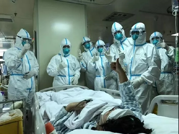 “解放軍來了,我們更加堅(jiān)定必勝信心!”看到軍隊(duì)的醫(yī)療隊(duì)員出現(xiàn)在面前,一名重癥患者情不自禁舉起大拇指“點(diǎn)贊”。(圖片來源:軍報(bào)記者微信公眾號)