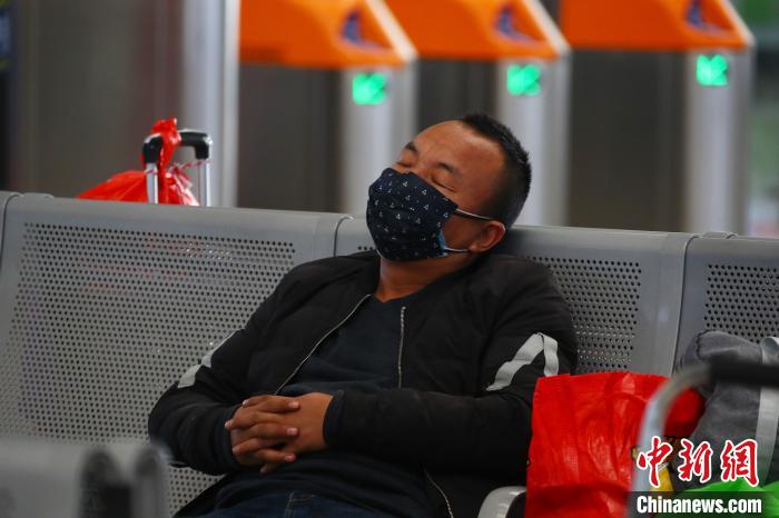 南昌西站候車大廳內,戴著口罩打盹的旅客。 劉占昆 攝