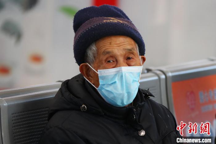 南昌西站候車大廳內,戴著口罩的老人。 劉占昆 攝
