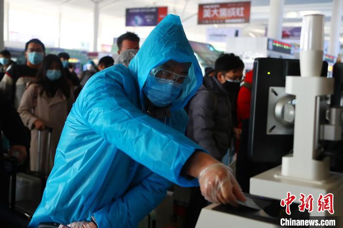 穿著一次性雨衣,戴著護目鏡的旅客正在刷身份證進站。 劉占昆 攝