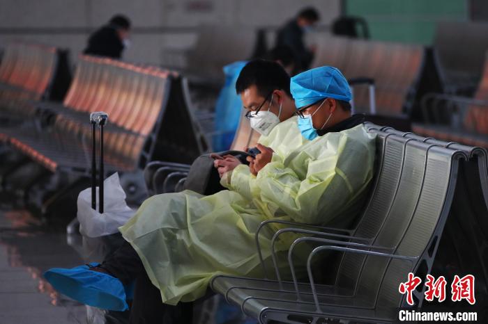 南昌西站候車大廳內,穿著一次性雨衣,戴著護目鏡的旅客正在候車。 劉占昆 攝