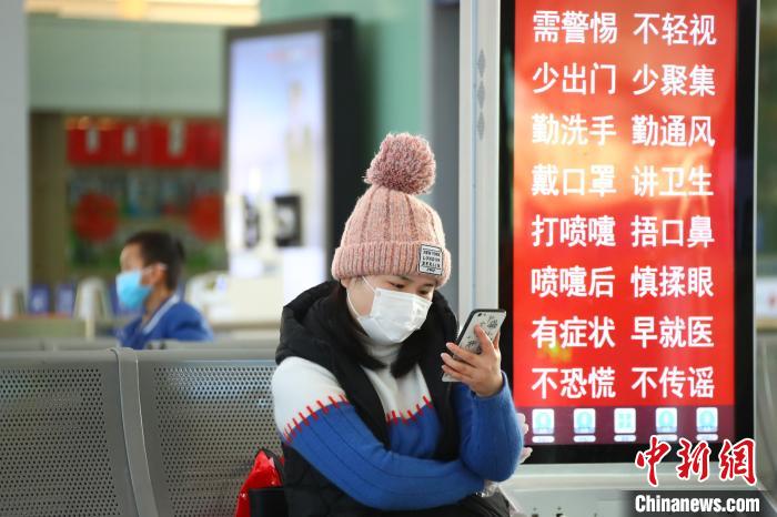 南昌西站候車大廳內,戴著帽子和口罩,正在玩手機的旅客。 劉占昆 攝