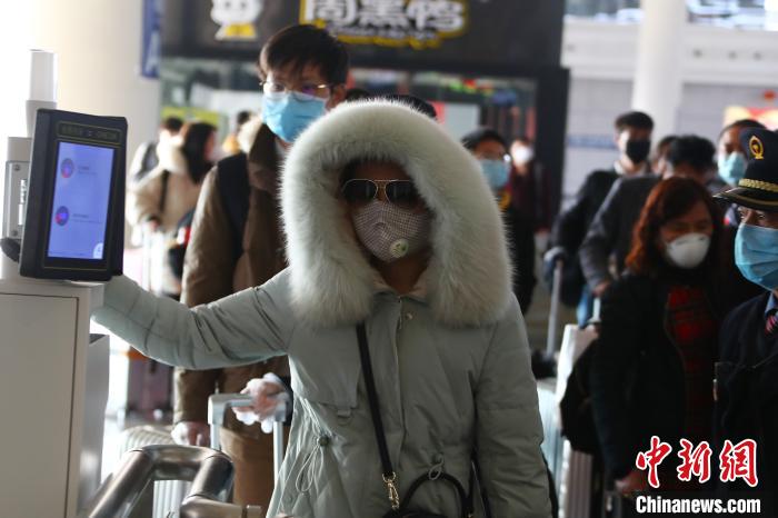 戴著眼鏡和口罩的旅客,把自己包裹得嚴嚴實實刷身份證進站。 劉占昆 攝