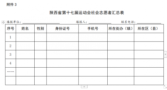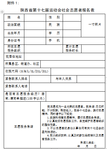 陜西省第十七屆運(yùn)動(dòng)會(huì)招募2000名社會(huì)志愿者榆林日?qǐng)?bào)訊 陜西省第十七屆運(yùn)動(dòng)會(huì)將于2022年8月6日在榆林開幕,這是榆林首次承辦的規(guī)模最大、人數(shù)最多、項(xiàng)目最全的全省綜合性體育盛會(huì)。承辦好省運(yùn)會(huì)對(duì)促進(jìn)城市發(fā)展、提升人民健康水平、展示城市良好風(fēng)貌具有重要意義。為全力做好第十七屆省運(yùn)會(huì)志愿服務(wù)工作,現(xiàn)面向社會(huì)招募2000名社會(huì)志愿者。 社會(huì)志愿者定義 社會(huì)志愿者是賽會(huì)期間在賽場(chǎng)周邊、社會(huì)公共場(chǎng)所,通過開展陜西省第十七屆運(yùn)動(dòng)會(huì)宣傳、精神文明建設(shè)、文明交通、文明上網(wǎng)、文明餐桌、文明旅游、環(huán)境保護(hù)、城市治理、扶殘助老、移風(fēng)易俗、垃圾分類、應(yīng)急救援等領(lǐng)域的文明風(fēng)尚志愿服務(wù)傳播活動(dòng),助力公共秩序維護(hù)、社會(huì)氛圍營(yíng)造、賽場(chǎng)文明宣傳、和諧環(huán)境創(chuàng)建的志愿者,是省運(yùn)會(huì)志愿者的重要組成部分。 招募時(shí)間、對(duì)象 招募時(shí)間:2022年4月18日—5月10日。 招募對(duì)象:以全市民間志愿服務(wù)組織的志愿者、中省駐榆各企事業(yè)單位和民營(yíng)企業(yè)的干部職工志愿者為主。 招募條件 1.自愿參加省十七運(yùn)志愿服務(wù)。 2.年滿18周歲,居住地在榆林市,且具備開展志愿服務(wù)所需要的身體條件和心理素質(zhì),擁有良好溝通協(xié)調(diào)能力。 3.遵守中華人民共和國(guó)法律法規(guī),無犯罪記錄。 4.具有良好的道德品質(zhì),高度負(fù)責(zé)的工作態(tài)度,能夠全程參加崗前培訓(xùn)及相關(guān)活動(dòng)。 5.為“全國(guó)志愿服務(wù)信息系統(tǒng)”實(shí)名注冊(cè)志愿者,服務(wù)時(shí)長(zhǎng)600小時(shí)以上者優(yōu)先。 6.參加過全國(guó)十四運(yùn)會(huì)和殘?zhí)貖W會(huì)志愿服務(wù)者優(yōu)先。 招募流程 以省十七運(yùn)志愿服務(wù)項(xiàng)目為牽引,以志愿服務(wù)組織為報(bào)名單位。 1.中省駐榆各企事單位、民營(yíng)企業(yè)、全市各級(jí)各類民間志愿服務(wù)組織認(rèn)真策劃出適合本團(tuán)體開展的省運(yùn)會(huì)志愿服務(wù)項(xiàng)目,確定參與項(xiàng)目的志愿者,由團(tuán)隊(duì)負(fù)責(zé)人統(tǒng)一填報(bào)志愿者信息表(附件1)、項(xiàng)目信息表(附件2)、志愿者統(tǒng)計(jì)表(附件3)后,按照相關(guān)報(bào)名方式報(bào)名。 2.經(jīng)中共榆林市委文明辦、榆林市志愿者服務(wù)總會(huì)審核確定項(xiàng)目和志愿者后,報(bào)陜西省第十七屆運(yùn)動(dòng)會(huì)榆林市籌委會(huì)志愿者工作部。 3.確定入選志愿者、志愿服務(wù)項(xiàng)目名單后,籌委會(huì)志愿者工作部將會(huì)以電話、短信等方式通知入選對(duì)象。 權(quán)益與保障 1.大賽結(jié)束后將獲得一份志愿者證書,頒發(fā)省運(yùn)會(huì)紀(jì)念品。 2.對(duì)于表現(xiàn)突出的志愿者、志愿服務(wù)項(xiàng)目,將有機(jī)會(huì)被評(píng)選為榆林市“最美志愿者”“最佳志愿服務(wù)項(xiàng)目”。 3.將為志愿者購(gòu)買人身意外傷害保險(xiǎn),提供志愿者標(biāo)志服、服務(wù)工具等。 報(bào)名方式 請(qǐng)有意報(bào)名的中省駐榆各企事業(yè)單位、民營(yíng)企業(yè)將相關(guān)表格填寫完成后直接發(fā)送到指定郵箱;各縣市區(qū)民間志愿服務(wù)組織與所在縣市區(qū)的宣傳部(文明辦)聯(lián)系報(bào)名。 指定郵箱:79685251@qq.com 聯(lián)系電話:0912-3283858,聯(lián)系人:謝貞 陜西省第十七屆運(yùn)動(dòng)會(huì) 榆林市籌委會(huì)志愿者工作部 2022年4月18日