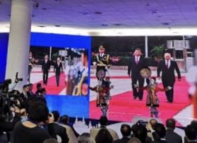 5月11日上午,在主賓國(guó)國(guó)家館開(kāi)館儀式上,俄羅斯、柬埔寨用具有當(dāng)?shù)靥厣奈璧副硌,歡迎到訪的嘉賓。