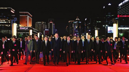 (本圖來(lái)源:陜西日?qǐng)?bào)記者 宋紅梅攝) 又訊(記者 李濟(jì)樸)5月10日晚,雄偉的西安城墻永寧門(mén)前,一場(chǎng)盛世大唐迎接貴賓的最高禮儀,迎接著前來(lái)參加第四屆絲綢之路國(guó)際博覽會(huì)暨中國(guó)東西部合作與投資貿(mào)易洽談會(huì)的中外嘉賓,向世界展示著東方神韻。 全國(guó)政協(xié)副主席高云龍、俄羅斯聯(lián)邦總統(tǒng)駐烏拉爾聯(lián)邦區(qū)全權(quán)代表尼古拉·尼古拉耶維奇·楚卡諾夫、柬埔寨副首相尹財(cái)利、陜西省委書(shū)記胡和平、陜西省省長(zhǎng)劉國(guó)中等出席入城式。 一條絲綢鋪出的路,古往今來(lái)穿越時(shí)空;一曲震撼人心的旋律,彰顯大唐盛世之繁華。當(dāng)晚8時(shí)50分,入城儀式開(kāi)始。來(lái)自俄羅斯、柬埔寨、韓國(guó)、馬來(lái)西亞等國(guó)家和地區(qū)的200余位各國(guó)政要、部長(zhǎng)級(jí)官員、地方領(lǐng)導(dǎo)人、國(guó)際組織代表、大型企業(yè)負(fù)責(zé)人及知名專家學(xué)者,跟隨裝扮的宮廷仕女由御道中段向前徐徐行進(jìn)。南門(mén)廣場(chǎng)上擺開(kāi)了迎賓陣列,嘉賓們沉醉在動(dòng)人的舞姿和古色古香的唱誦中,駐足欣賞,合影留念。 落吊橋,開(kāi)城門(mén),迎貴賓。隨著吊橋落下,城門(mén)徐徐打開(kāi)。踏著腳下的千年之路,嘉賓們穿過(guò)流光溢彩的護(hù)城河,領(lǐng)略著盛唐遺風(fēng)的獨(dú)特魅力。繞過(guò)月城、甬道,來(lái)到永寧門(mén)內(nèi)中心地帶甕城,嘉賓們?cè)诖擞^看大唐迎賓盛禮文藝演出《夢(mèng)長(zhǎng)安》。由“永恒之城”“唐韻風(fēng)神”“盛世國(guó)都”三個(gè)章節(jié)構(gòu)成的演出,以震撼人心的旋律,彰顯大唐盛世之繁華,展現(xiàn)出禮儀之邦對(duì)世人友好往來(lái)的熱切歡迎,令嘉賓們仿佛穿越時(shí)空,身臨其境。 陜西省副省長(zhǎng)魏增軍、西安市市長(zhǎng)李明遠(yuǎn)等出席入城式。 編輯:齊敏 相關(guān)推薦: